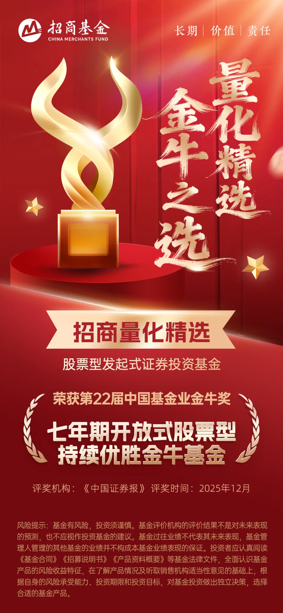 12月30日,由中国证券报主办的“改革与重构——2025公募基金高质量发展大会暨第22届基金业金牛奖颁奖典礼”在上海举行,招商量化精选股票型发起式证券投资基金(A类:001917,C类:007950)荣获“七年期开放式股票型持续优胜金牛基金”奖项。该基金自2016年3月15日成立以来,截至三季度末累计收益率达280%,同期业绩比较基准收益率为78.83%,超额收益率达201.17%,近十年来持续为投资者创造超额收益,是践行公募基金高质量发展的优秀实践。