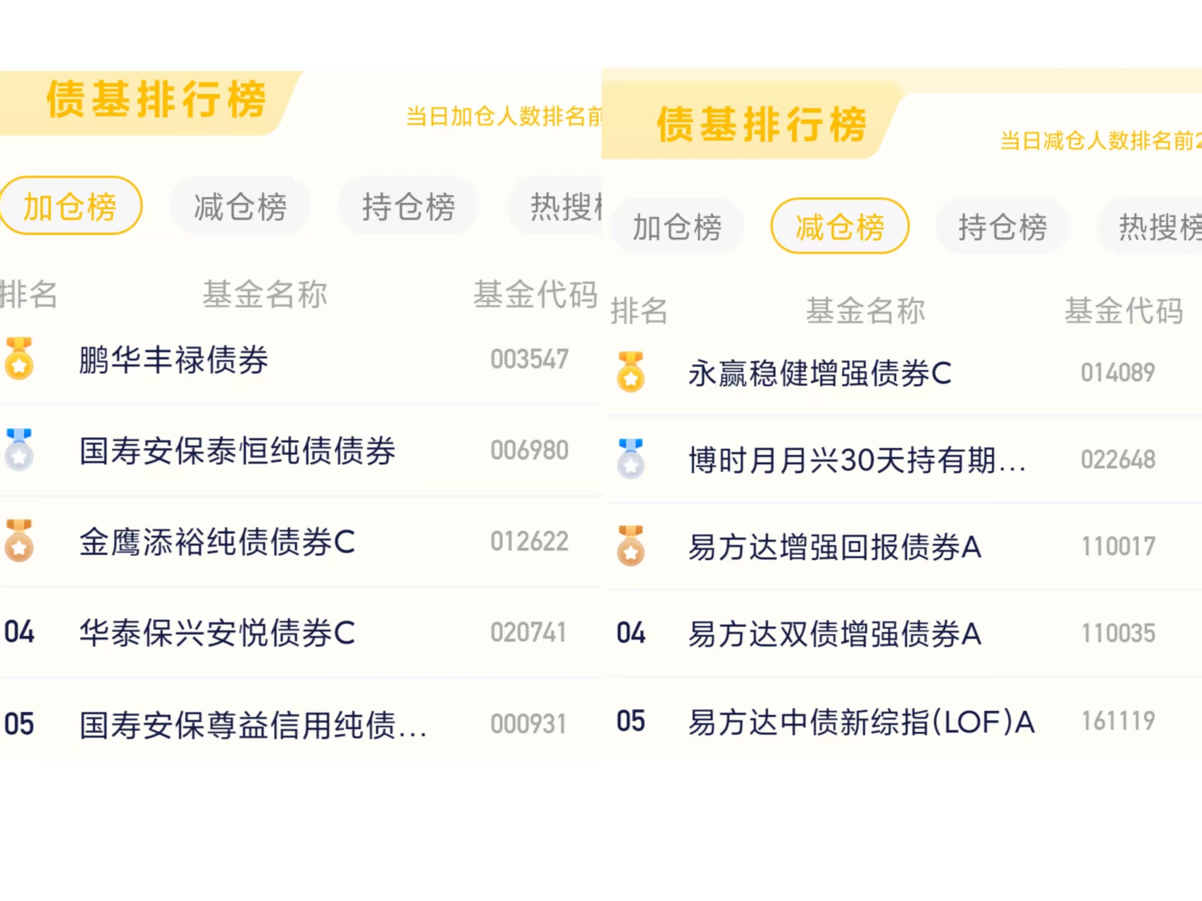七、债券基金加减仓榜单