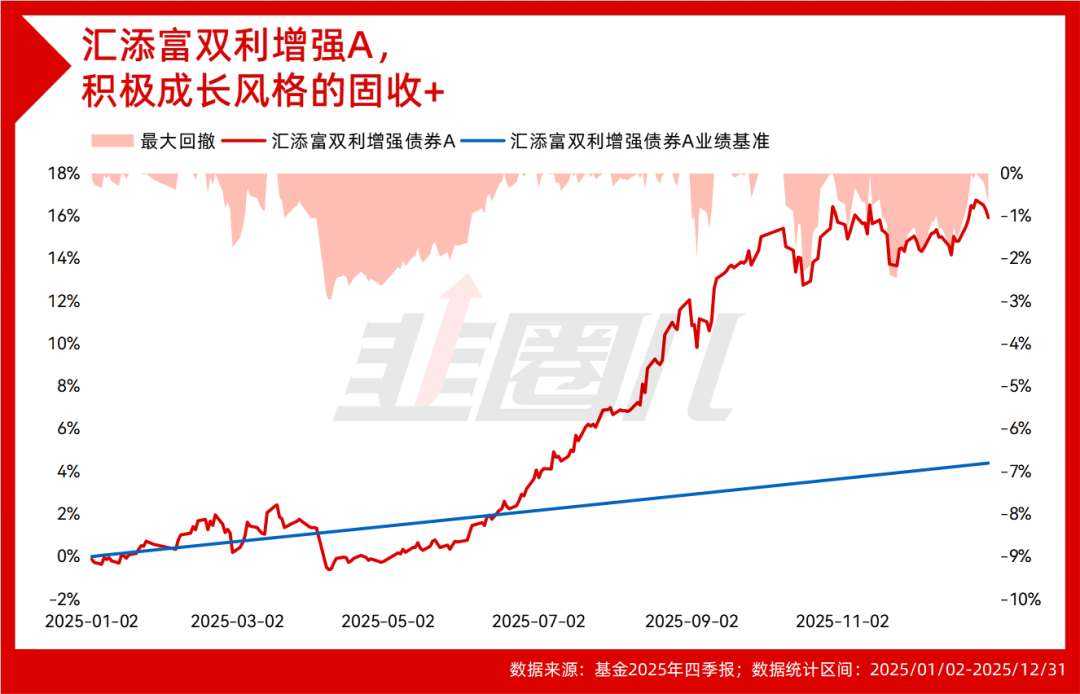 从收益来看,2025年汇添富双利增强A的收益有15.93%,远超4.25%的业绩基准,最大回撤在3%左右,本身也是成长型固收+合理的表现。