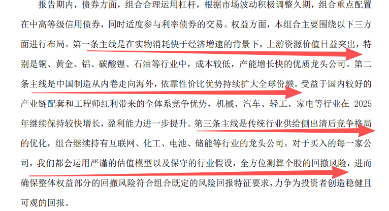 同时在季报里,基金经理也总结了上游资源品、中国制造出海,以及传统行业供给出清这几条大的主线。
