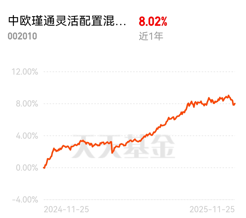 现在市场结构性分化特别严重,有的板块涨上天有的持续低迷,资产轮动又快,普通投资者很难把握。中欧瑾通灵活配置混合C近1年收益8.02%,“固收+”策略能对冲不同市场风险,不管板块怎么轮动,都能稳步赚收益。