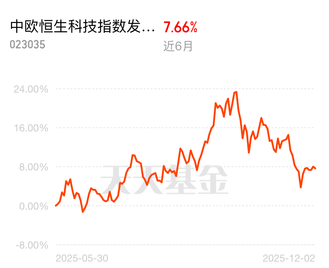 港股流动性宽松加持,科技板块估值修复行情正在上演,低位布局性价比超高。中欧恒生科技指数发起 (QDII) C 近 6 个月 7.66%,跟踪恒生科技指数,清晰透明,现在上车锁定修复收益。