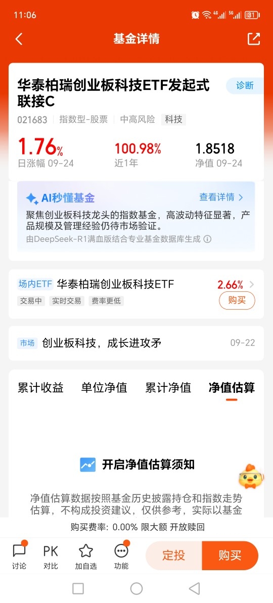 今天创业板指的表现,让不少人看到了科技板块的机会。要是你也想在创业板科技里分杯羹,华泰柏瑞值得考虑。它瞄准的是创业板科技龙头,今天涨了1.76%,近一年更是涨了一倍还多(100.98%)!当然,它风险是中高,投资这事儿得自己拿主意,适合那些看好创业板科技成长、能接受波动的朋友,想跟上创业板科技行情的,不妨多了解了解它。