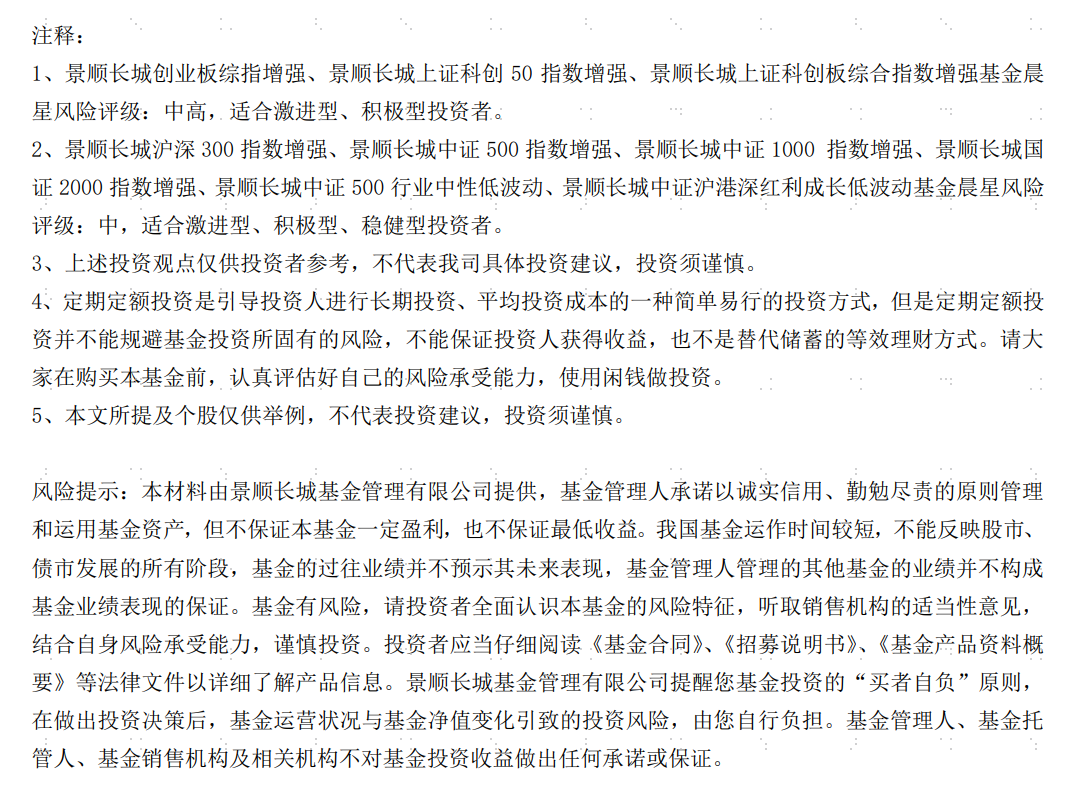 创业板方面,创业板综指囊括所有创业板股票,创业板指则是精选100只样本股;比较而言,创业板综指作为创业板市场的全样本指数,覆盖面更广,不仅纳入创业板龙头,也兼顾一大批潜在成长空间较大的创业板中小盘,呈现出更高弹性的特征;板块轮动时有助于更好捕捉行情,加上成分股的业绩分化较大,机构覆盖度较低,有助于量化策略创造超越指数的收益。投资标的上欢迎关注$景顺长城创业板综指增强A(OTCFUND|008072)$、$景顺长城创业板综指增强C(OTCFUND|019239)$。