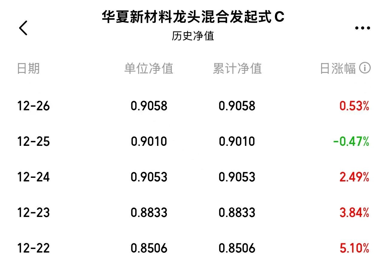 之前确实我低估了它的业绩,今天一看这基近5天4天正收益,上周最牛单日收涨5%+,一周收益能近12%,确实很给力,$华夏新材料龙头混合发起式C$产品聚焦AI新材料,弹性大,成长空间也好,所以还是得重点布局一下了