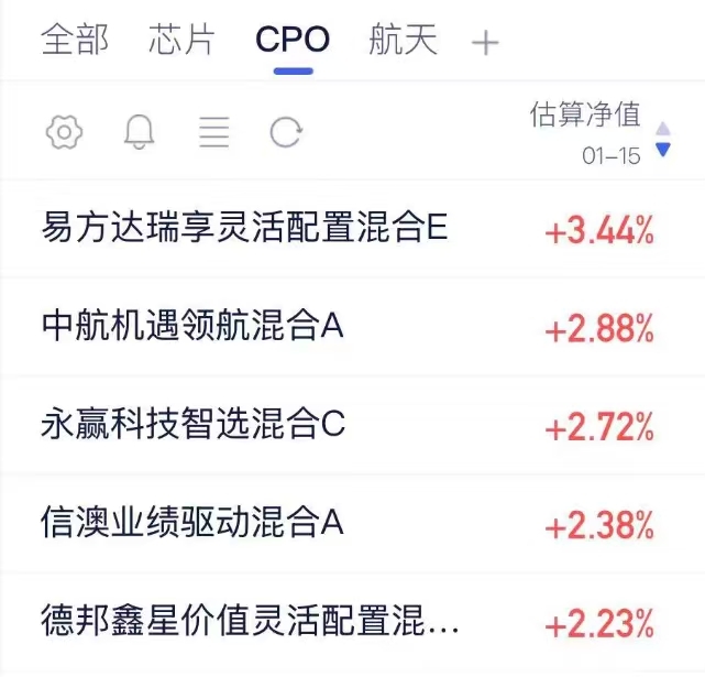 CPO概念板块涨超3%,今天比较好,$易方达瑞享混合E$ 估值+3.88%,自成立至今,涨幅已超 430%,上涨爆发力强,基金经理长期业绩表现好,有理由相信他全市场配置的策略,长期看好,业绩值得期待。