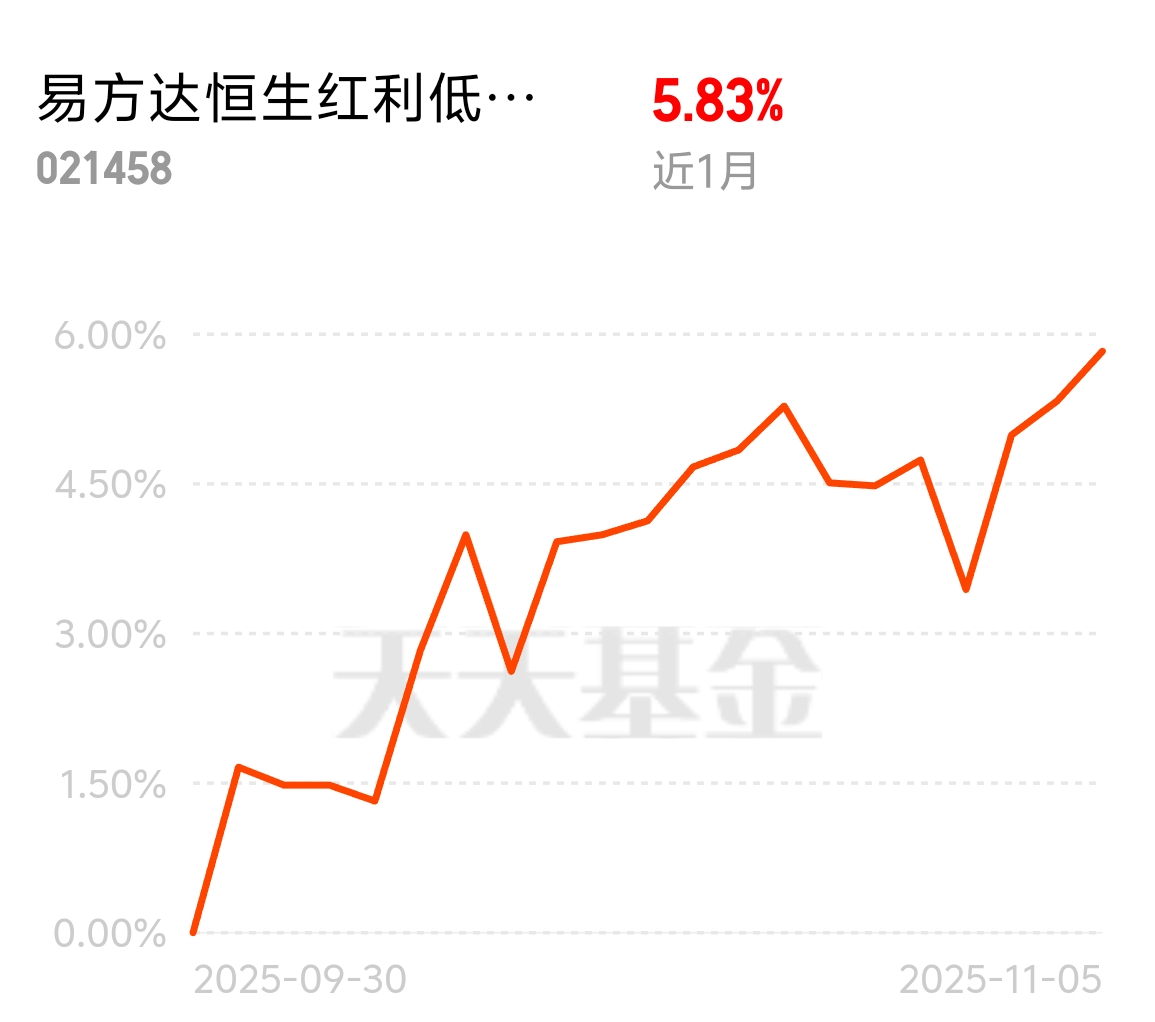 港股近期迎来行情走强,不少板块都有不错的上涨表现,市场赚钱效应凸显。易方达恒生红利低波联接C没让人失望,近1个月收益5.83%,而且费率超低,大大节省了投资成本,想参与港股的可以重点关注。