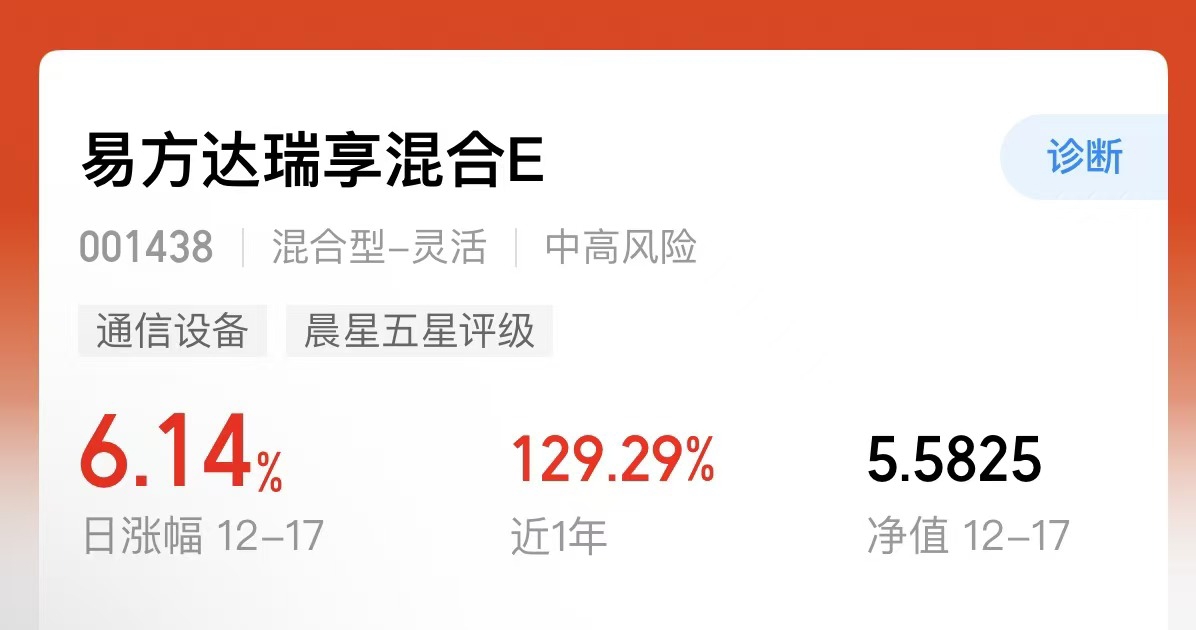今天市场分化挺明显,不过每次大盘想稳住,还得看CPO和科技股发力,这主线地位坐得稳稳的。我看了一下,易方达瑞享混合E这只基金最近表现真不错,它就是专门埋伏在科技成长赛道的,特别是CPO和算力这块拿捏得很准。昨天单日大涨超6%,近一年涨幅逼近130%,这收益太能打。现在的行情就是“轻指数、重个股”,跟着这种踩准节奏的主动基走,心里会踏实很多。