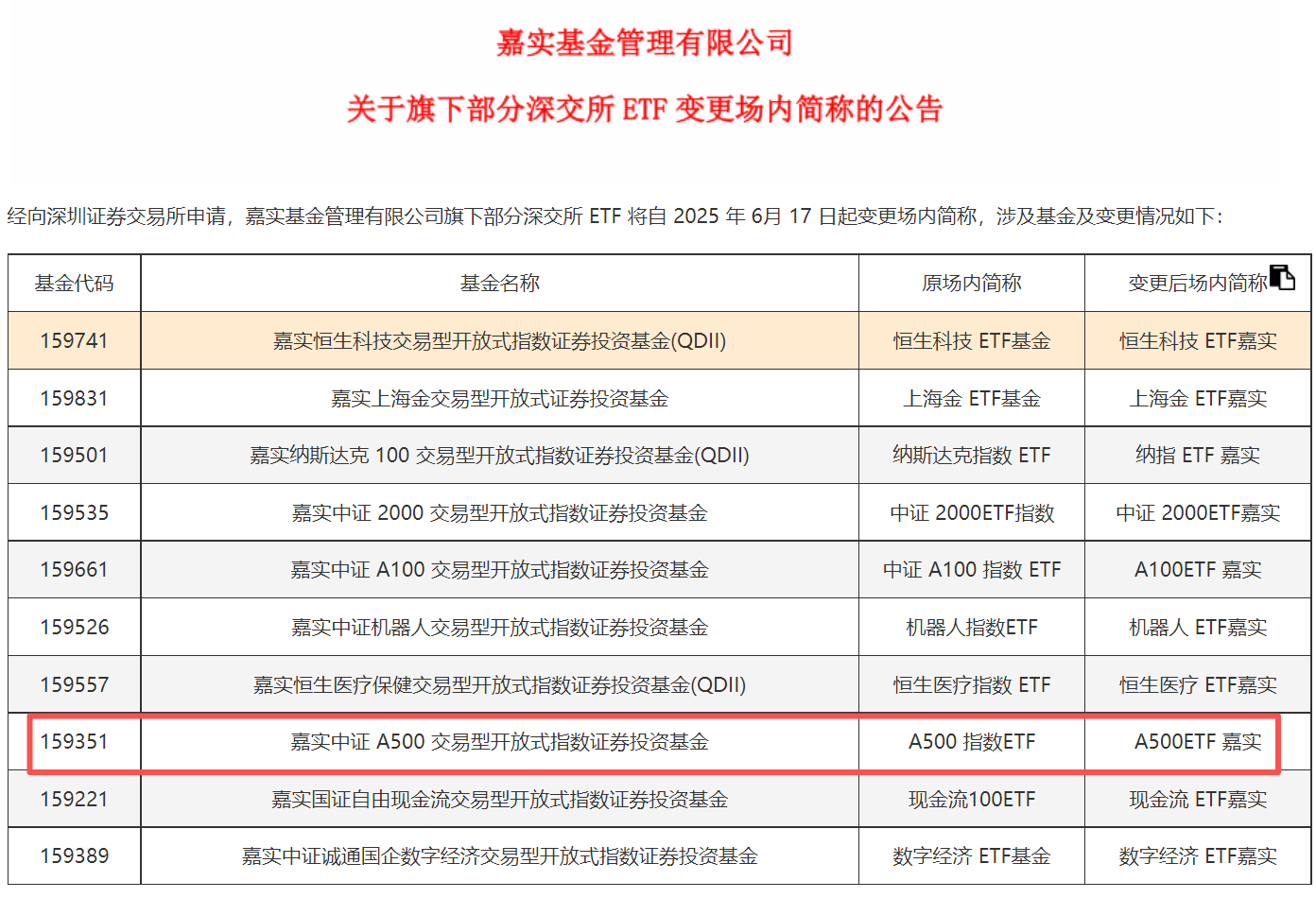 嘉实基金的公告显示,6月17日起,旗下嘉实中证A500ETF(159351)的场内简称由“A500指数ETF”变更为“A500ETF嘉实”。