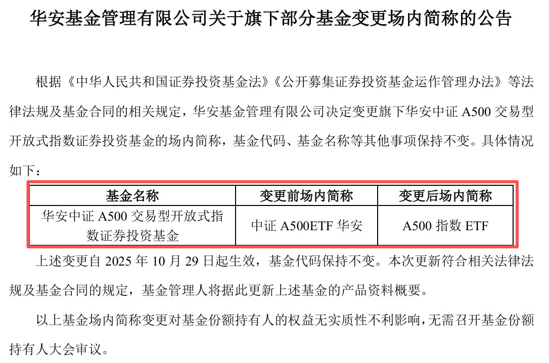 华安中证A500ETF(159359)变更了场内简称,变更前是“中证A500ETF华安”,变更后是“A500指数ETF”。