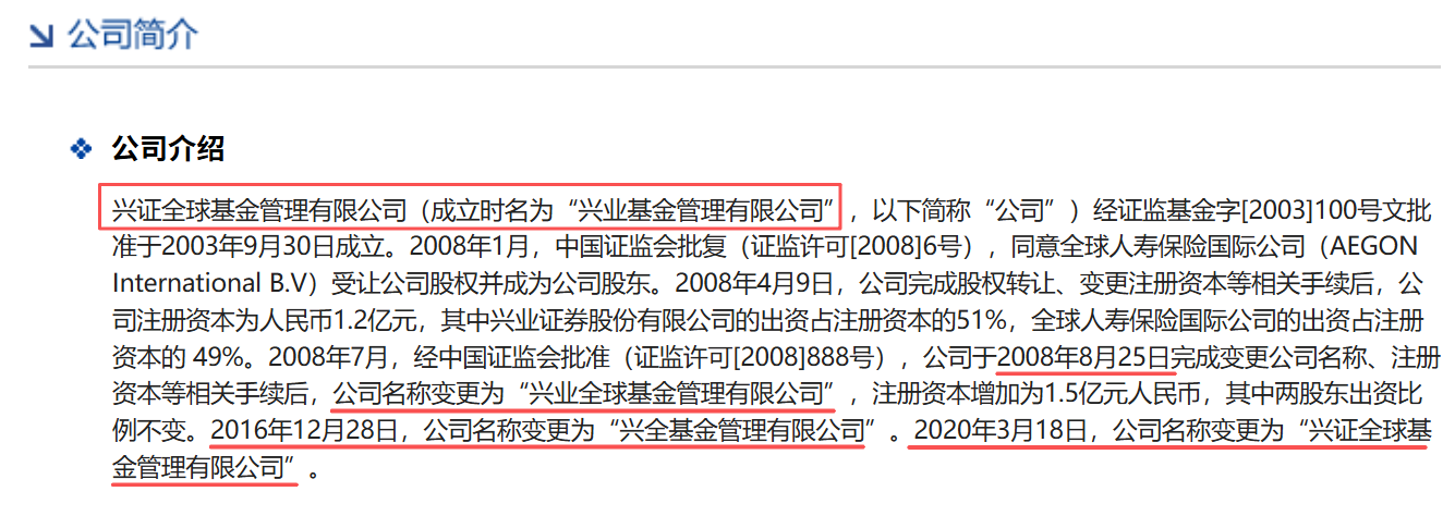 2003年9月30日成立时的名字是兴业基金。后来全球人寿入股后,在2008年更名为兴业全球基金,后又在2016年和2020年分别更名为兴全基金、兴证全球基金。
