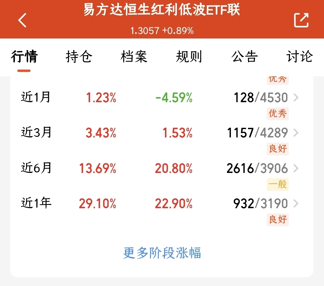 经过最近一段时间的调整,这两天股市终于大幅反弹了。我低位加仓的CPO也终于吃到一轮大涨,选择止盈一部分,把资金转到红利,稳住收益。密切关注市场变化,行情还不是很稳,年底了,市场波动比较大。$易方达恒生红利低波ETF联接C$ 近一年涨幅29.1%,表现还不错,加仓了!