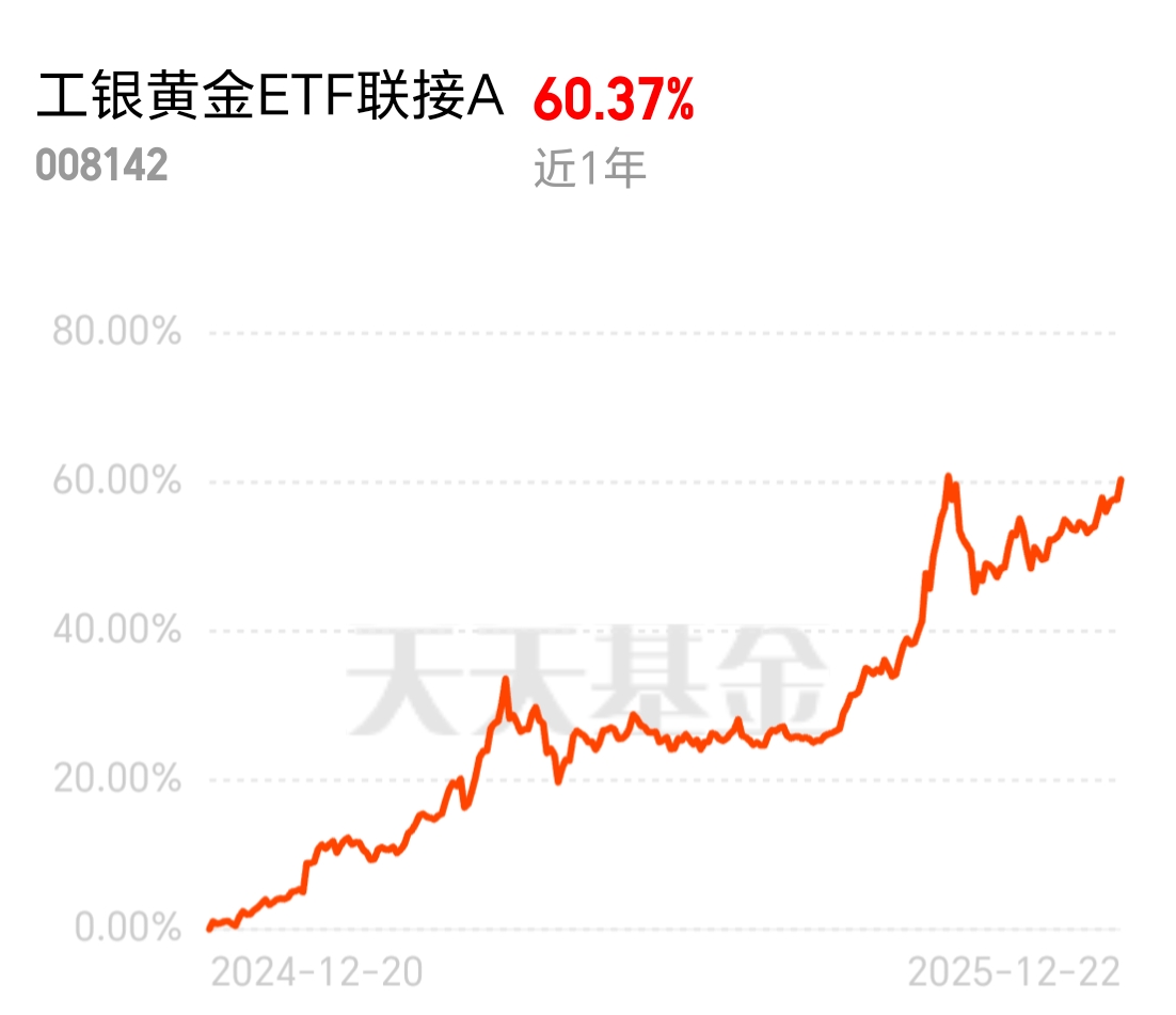 黄金今年真是猛涨啊,年底了还冲波大的,买实物金条不划算,这个没有保管费,费率还最低,挺合适。$工银黄金ETF联接A$