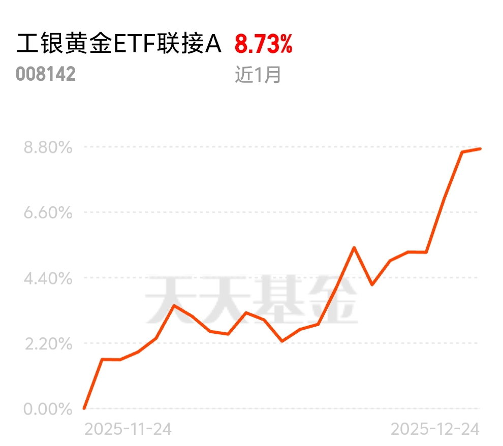 白银今年都翻倍了,黄金涨70%反而显得低调。趁着圣诞假期交投清淡,买了点工银黄金,管理费才0.15%,拿长线不心疼。