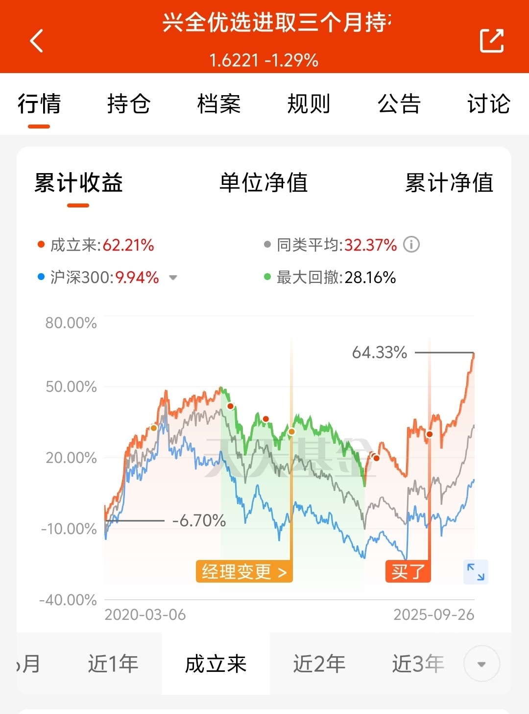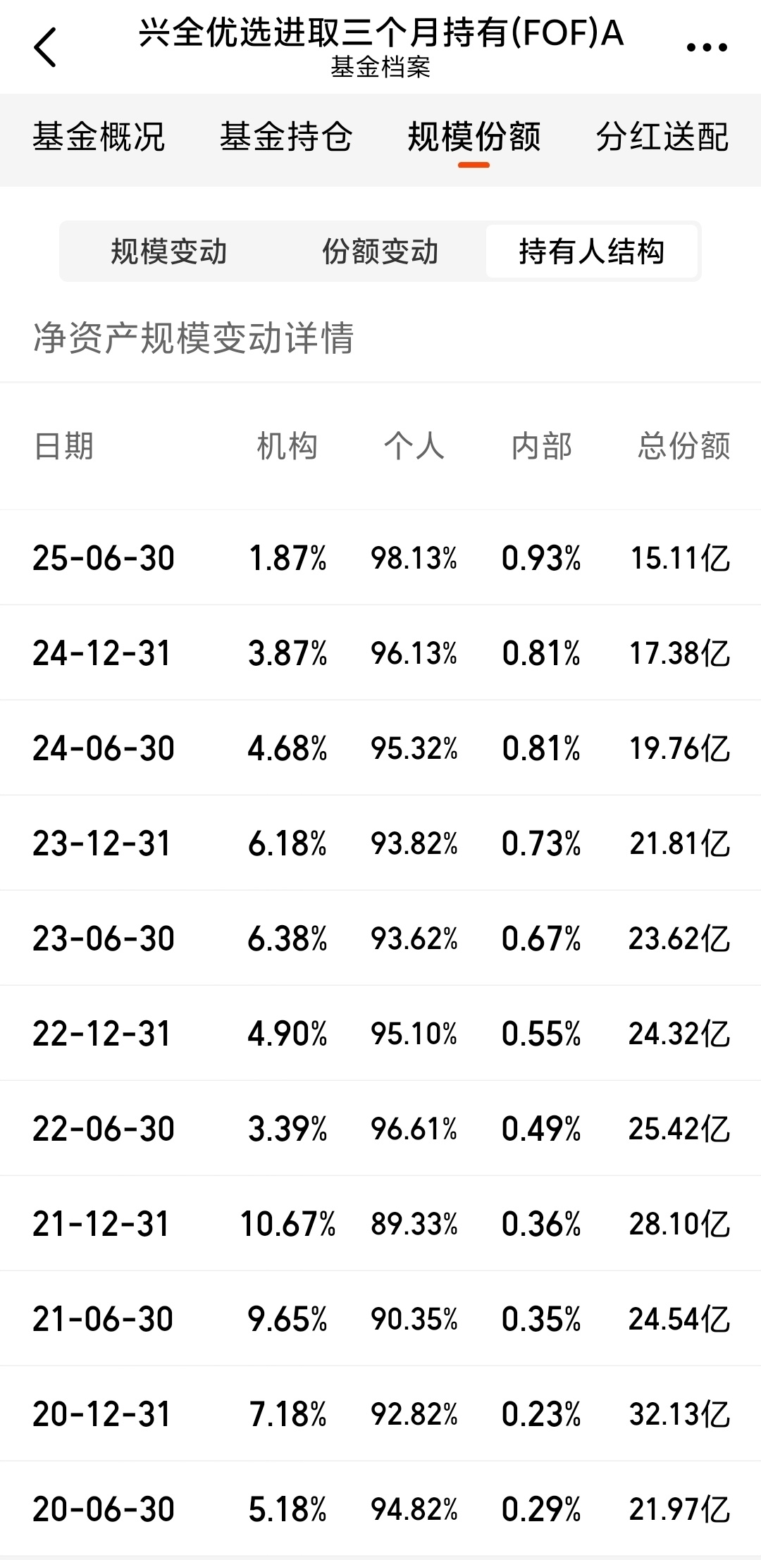 从这只FOF的持有人结构也可以看出,机构和散户的选择更多,时长有出入,但兴全基金内部员工对这只基金还是非常认可的。