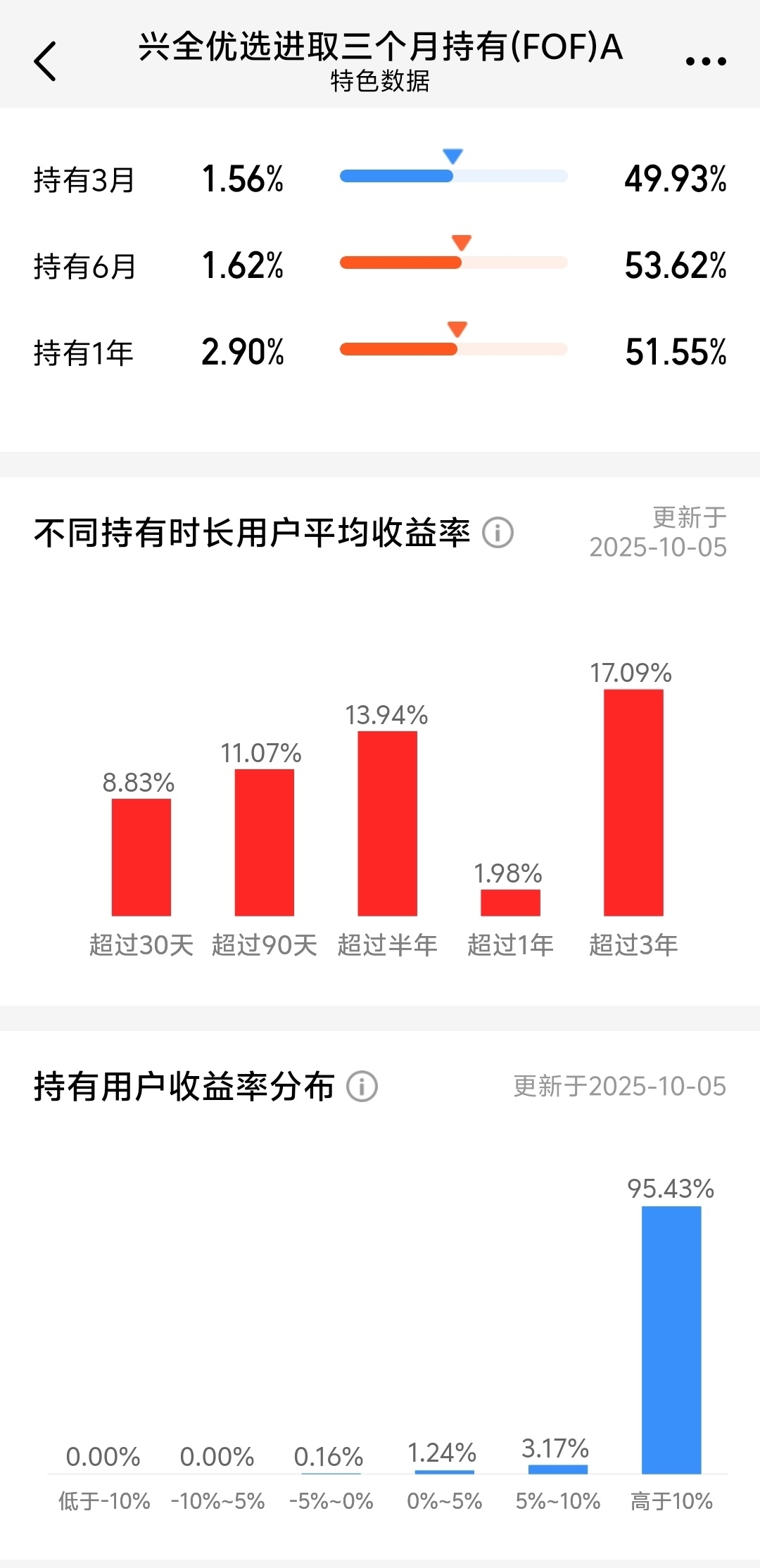 还是好友@快乐养基大师兄 说的对,多看数据,尊重客观事实,少听少看充满主观性的宏大叙事!未来,我依旧还会持续关注这只FOF产品,从2022年开始买入这只基金,一直持有到现在,中间加过一些仓,目前持有收益率也是24%+,暂时不会考虑止盈。但估值投资法告诉我目前不太适合追高买入,持有就好。