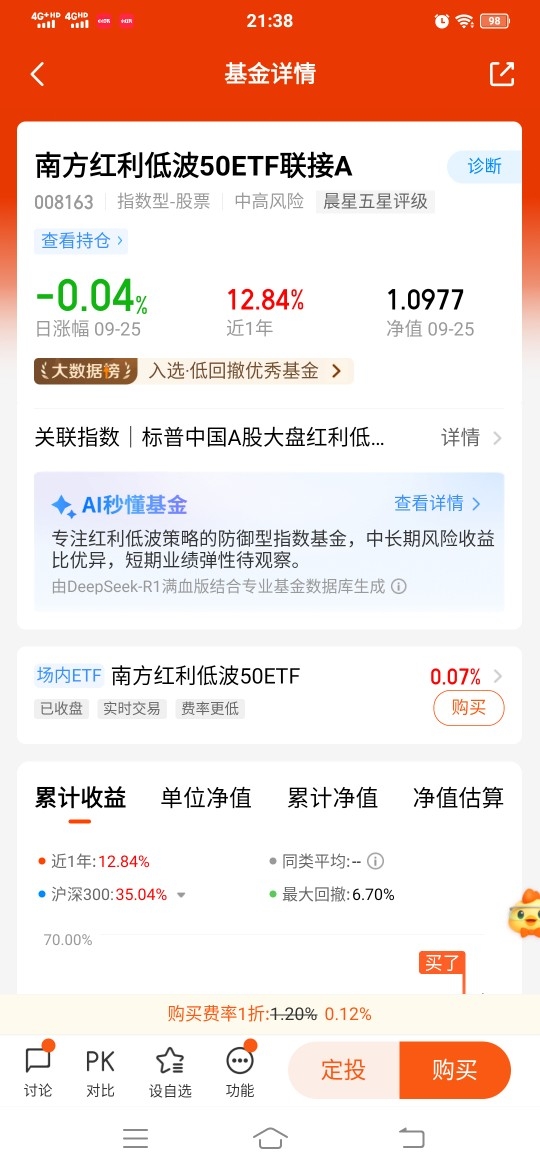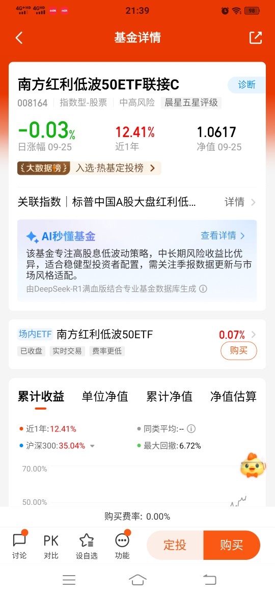 该基金紧密跟踪标普中国A股大盘红利低波50指数,通过“股息率+波动率”双重筛选机制,精选A股市场中股息率高且波动率低的50只大盘股。这种策略使其在市场波动中展现出显著的防御性:2022年沪深300下跌20%以上时,该基金回撤仅-8.36%;2025年Q1市场调整期间,其跌幅(-0.86%)不足沪深300指数(-5.2%)的五分之一。截至2025年9月19日,基金近一年净值增长19.03%,年化波动率比大盘低20%,夏普比率(1.14)显著优于同类产品,风险调整后收益能力突出。
