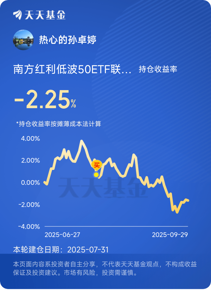其实7月买入时,市场正热炒科技、半导体,身边同事都在说“红利板块太慢了”。但我当时刚吃了“追热点”的亏:之前买的新能源基金,因为行业波动大,每月工资定投进去像“扔水里”,涨一天跌三天,心态全崩。后来刷理财知识时看到一句话:“毕业生理财,先求‘稳’再求‘赚’,红利板块就是A股的‘安全垫’”——抱着试试看的心态,我研究了南方红利低波,最后决定每月定投800元(差不多是我除去房租和生活费后的结余)。