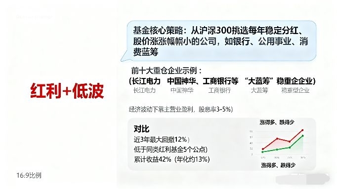 这只基金的核心策略是“选高股息的低波动股票”——简单说,就是从沪深300里挑那些“每年稳定分红、股价涨跌幅小”的公司,比如银行、公用事业、消费蓝筹这类。
