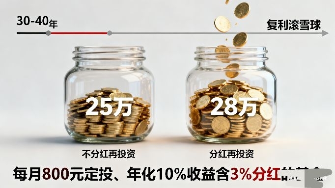 我们刚毕业,每月能定投的钱不多(我只有800),但胜在“时间长”——有30-40年的投资周期。红利板块的“分红再投资”,刚好能发挥复利的威力:比如一只年化收益10%、每年分红3%的基金,坚持定投10年,本金10万能变成28万;如果不分红再投资,只能变成25万。差的这3万,就是“分红再投资”的复利效果。