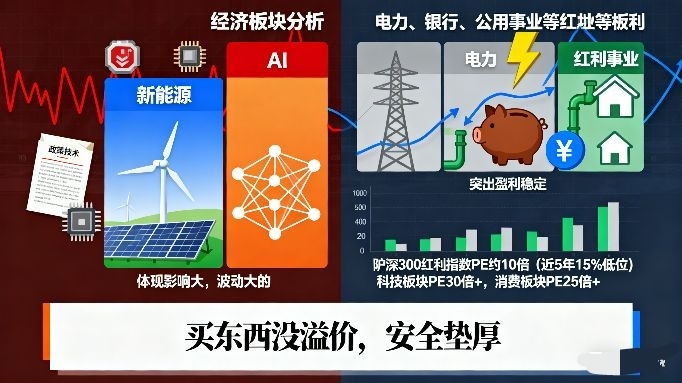 现在经济处于“温和复苏”阶段,很多高成长板块(比如新能源、AI)受政策、技术迭代影响大,波动也大;而红利板块的公司,大多是“刚需型”企业(比如电力、银行、公用事业),不管经济好不好,人们都要用电、存钱,这些公司的盈利很稳定。
