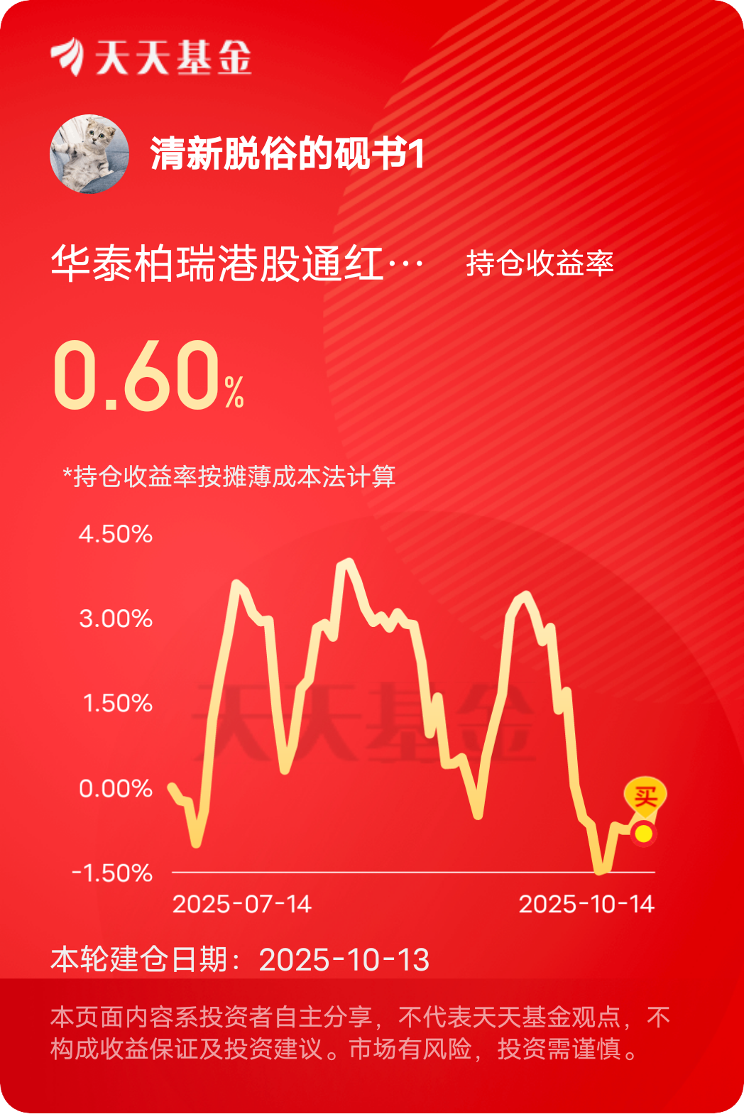 持基待涨没问题,$华泰柏瑞港股通红利ETF联接基金C$ 今日收涨0.64%,虽然涨幅不大但很稳健,这种震荡市况下还是要靠防御资产。