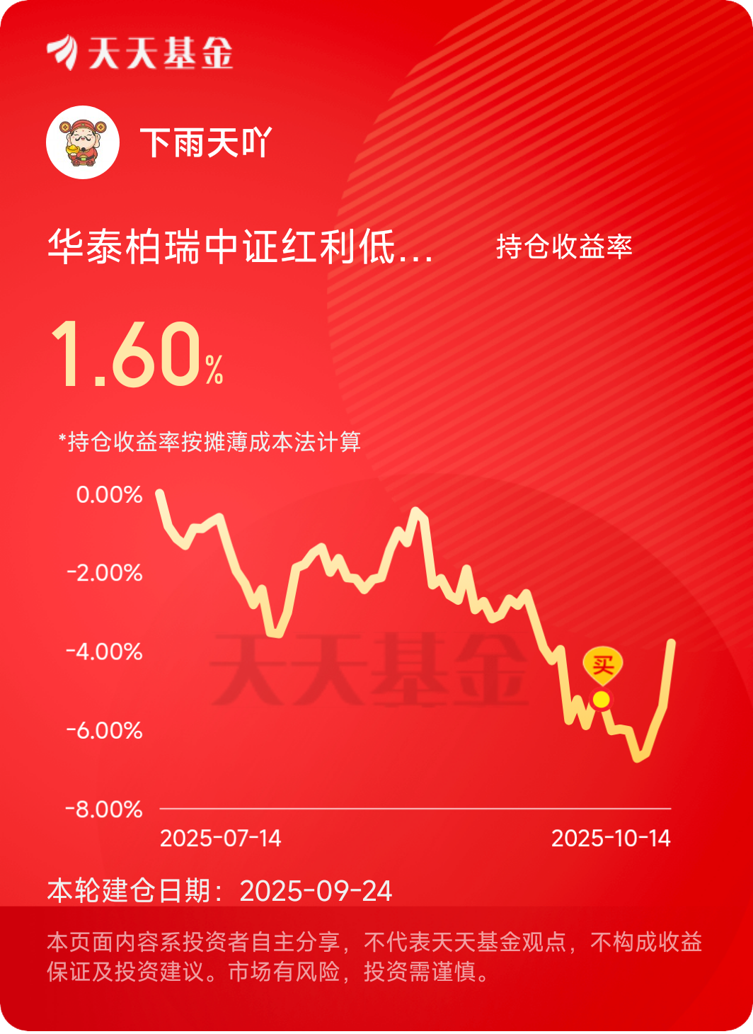 最近$华泰柏瑞中证红利低波ETF联接C$ 表现真不错,今天又涨1.70%,连续四天收红。看来低位红利板块确实值得重点关注,这节奏把握对了。