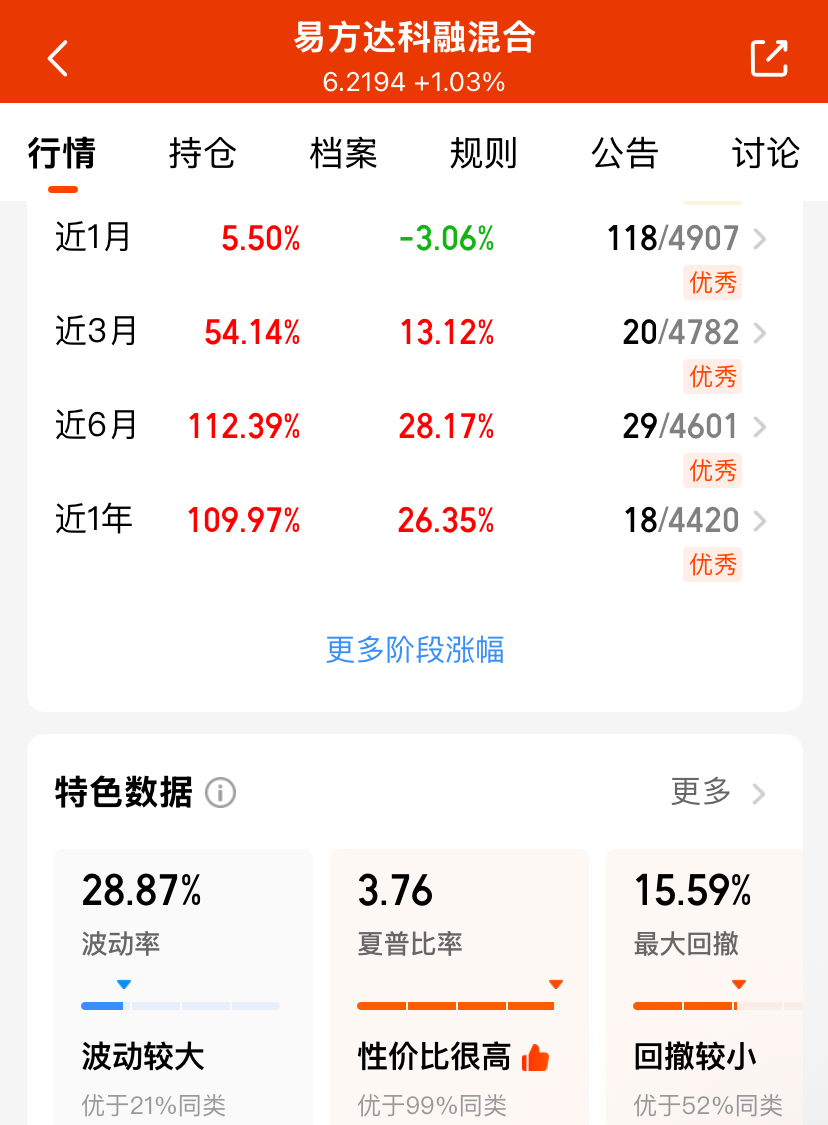 今天股市终于迎来一波反弹,牛市行情下板块轮动比较快,如果押注单一科技赛,容易回撤风险高,而易方达科融它不仅持有科技,还配有反内卷新能源,比较符合当前企稳重整的行情走势,夏普比率出色,值得期待一下的!#HBM4定价超预期!存储芯片迎超级周期#