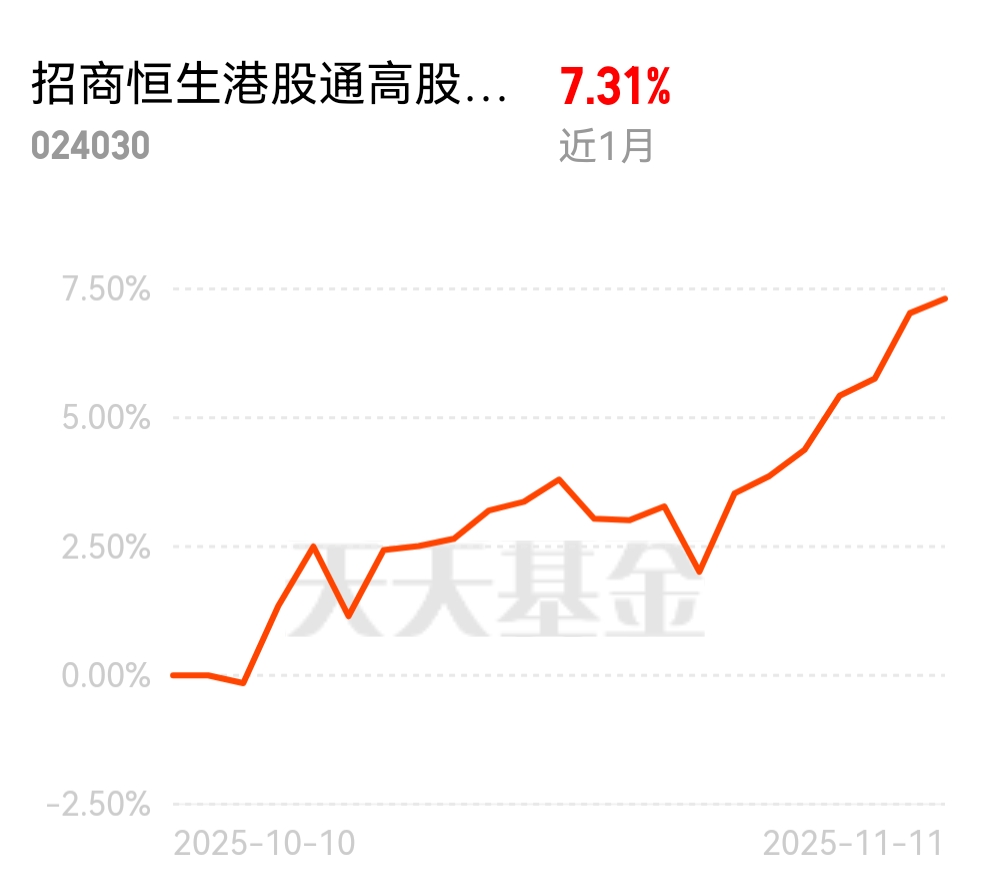 科技资产持续调整,资金避险情绪还在,红利板块今天继续补涨;这支$招商恒生港股通高