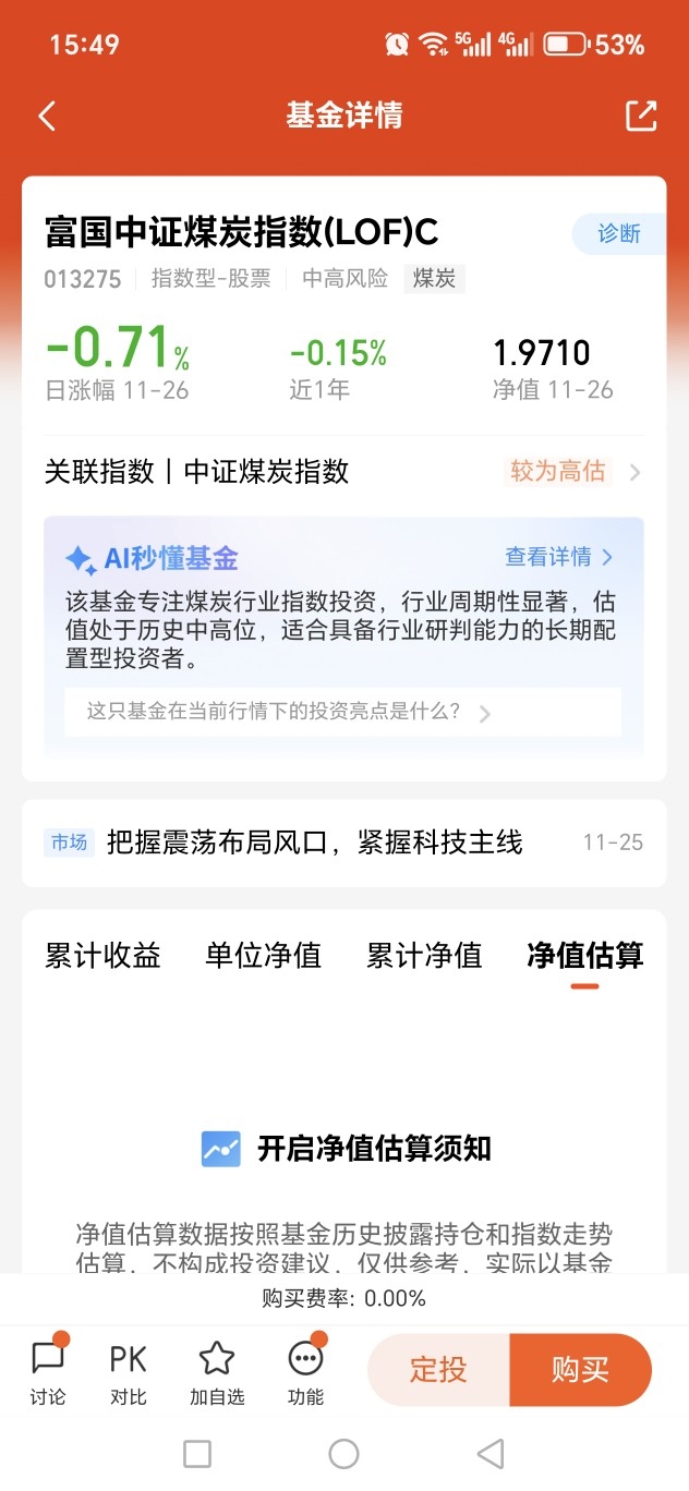 手里红利低波那块这阵子横着走,就分了一点仓位去富国中证煤炭C,它跟指数贴得特别紧