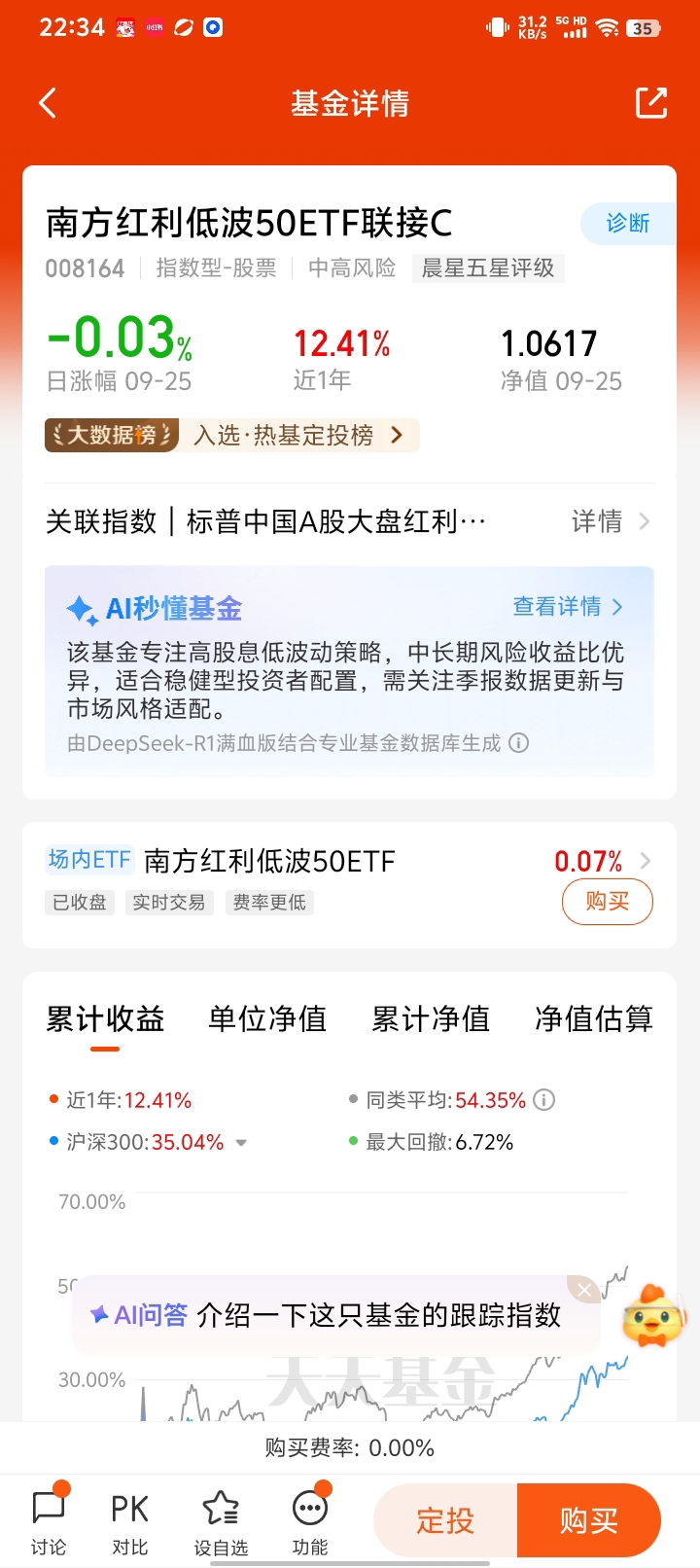 熊市抗跌:2022年沪深300下跌20%+,该基金回撤仅-8.36%;2025年Q1市场调整中微跌0.86%,同期沪深300跌5.2%。