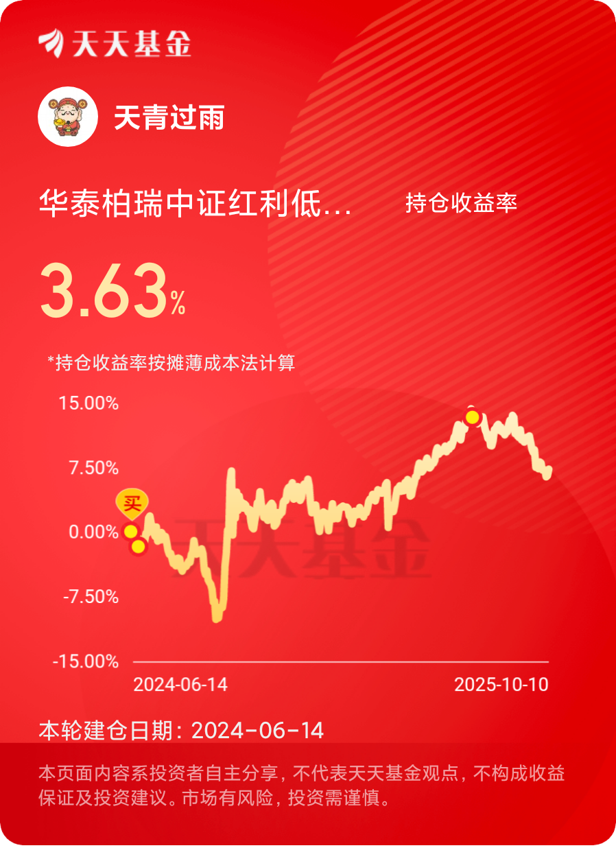 #券商把脉:冲击小于4月 黄金坑再现?# 经过前期调整,红利策略的防御价值又凸显了。华泰中证红利今天逆势上涨,就是最好的证明。$华泰柏瑞中证红利低波ETF联接C$ #晒收益# #存储芯片掀涨价潮!行业或迎超级周期#