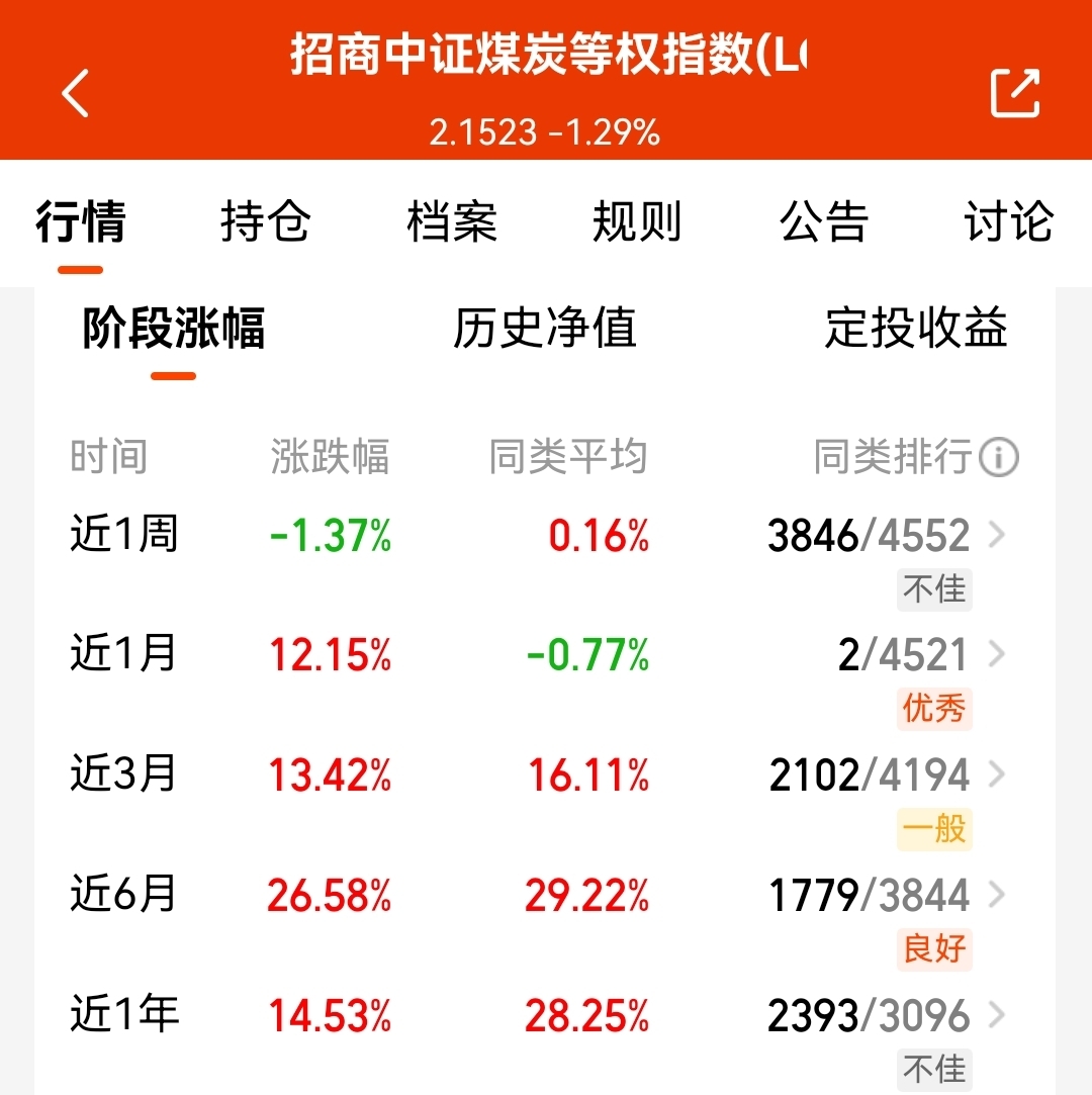 尤其是这支$招商中证煤炭等权指数(LOF)C$ ,持仓煤炭板块,目前估值涨进2%,再次领先其他,近半年收益也有26.58%了,也说明市场调整之际,资金防御倾向比较明显;