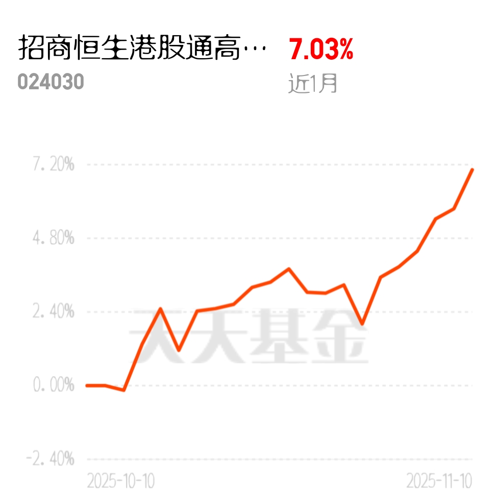 现在港股估值回到低位,高股息资产越来越受青睐,招商恒生港股通高股息低波动ETF联接C太给力了,昨日涨幅直接冲到1.20%,近1个月还涨了7.03%,低波动属性搭配实在收益,普通投资者也能放心跟上。