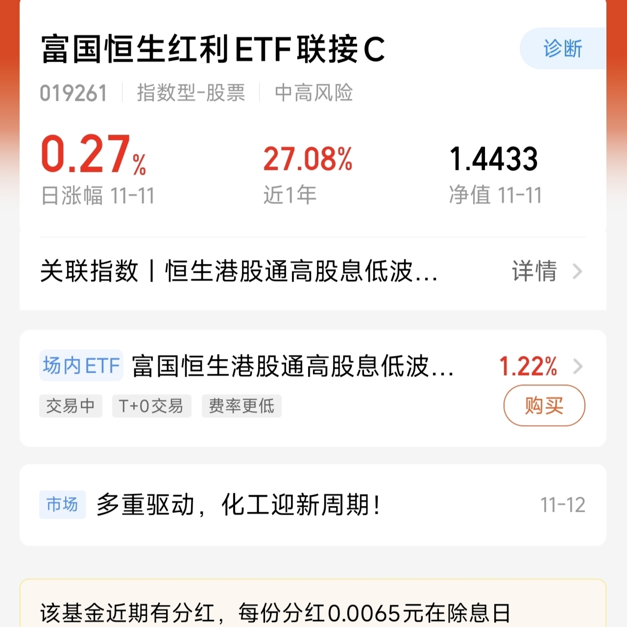 持仓南方红利低波C,又加了点富国恒生红利C,看中它聚焦港股高息低波资产,近1年涨