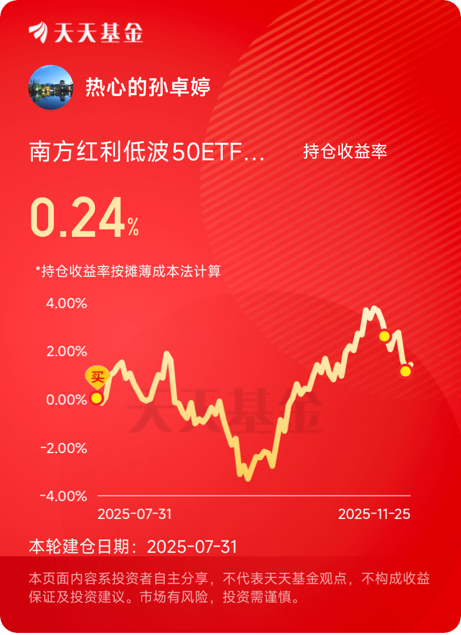于我而言,红利板块的魅力从不在于短期暴涨,而在于穿越周期的确定性。南方红利低波50ETF联接C聚焦“高股息+低波动”双核心,既享受了政策红利下的分红收益,又通过低波策略过滤了市场噪音,完美契合“不内卷、求稳赢”的投资逻辑。在业绩空窗期叠加年底震荡的市场环境中,这类“稳稳的幸福”或许比追高弹性更具智慧。