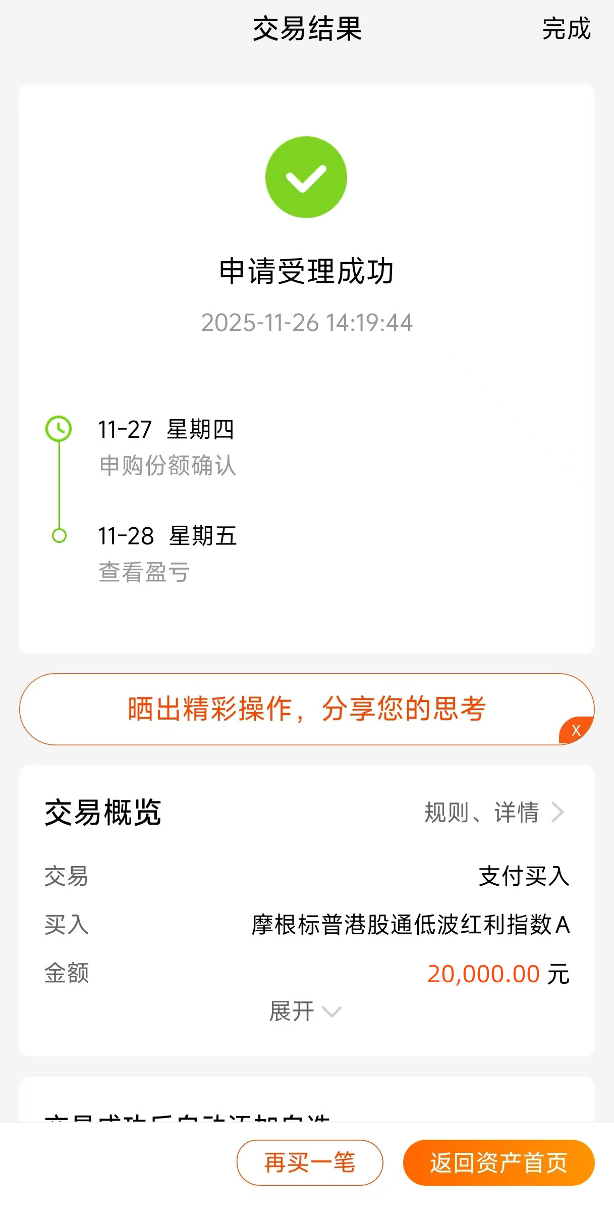 大盘震荡别心慌,红利资产才是硬道理!$摩根标普港股通低波红利指A$(005051)近一年涨32.94%,标普500才13%,沪深300才15%,摩根标普港股通低波红利指数A(005051)业绩吊打全场!这基金年内64次新高,抗跌性离谱,市场大跌时最大回撤才0.92%,夏普比率2.3,跑赢大盘90%时间!机构抢疯了,南向资金净流入3000亿,险资扎堆港股银行股,基金规模破200亿,成了港股红利“规模一哥”,54%是机构持仓!四季度分红潮火爆,银行股派现2600亿,重仓的招商银行分了262亿,基金股息率长期6%以上,估值底部(PB仅0.98倍)!对比A股红利,港股红利股息高2个点,收益碾压华泰柏瑞红利低波ETF联接A,加上港股对全球资金更敏感,美联储放水就是涨势加速器,年末配置一点,明年红包拿到手软! #低估补涨号启航#
