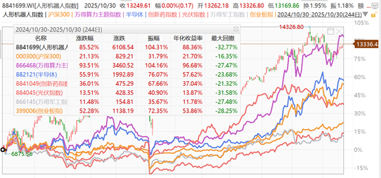 首先,我们拉一下几个主要科技赛道近一年的涨跌幅就会发现机器人的表现还是比较亮眼。人形机器人近一年的涨跌幅85.52%,跑赢创业板指超30%,大幅跑赢创新药、军工、光伏、半导体等指数,和算力指数差距也并不大。在目前业绩期缺乏催化的情况下,盘整消化估值也是正常的。