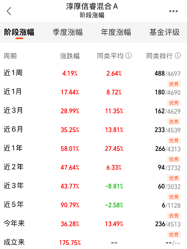 青春看到$淳厚信睿混合A(OTCFUND|008186)$的业绩还挺强的,近1个月就涨了17.44%、近1年涨超58%,而且成立以来多个阶段业绩排名优秀,不愧是晨星5星评级混基,近期净值屡创历史新高!