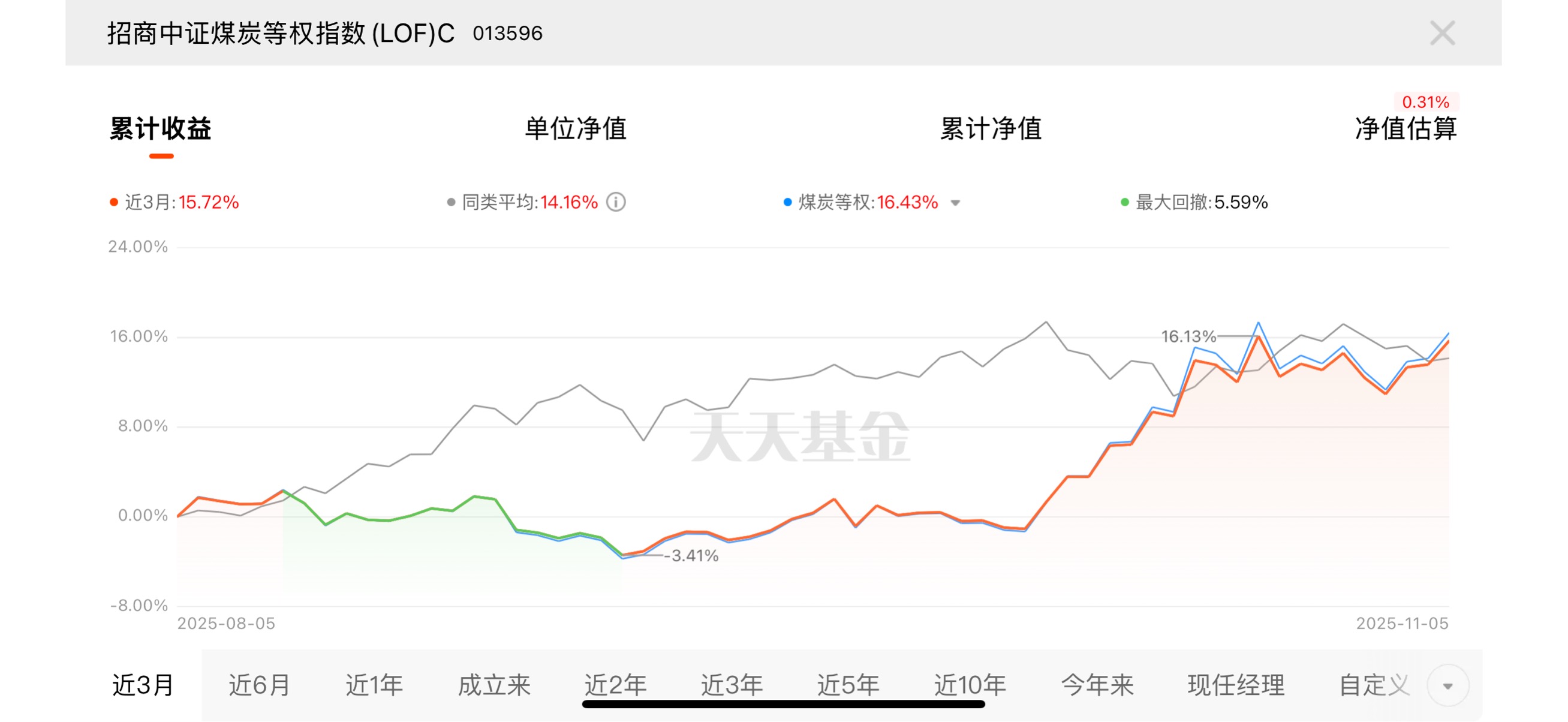 市场波动加大,煤炭板块的防御属性越来越突出。招商中证煤炭等权指数C昨日日涨幅1.