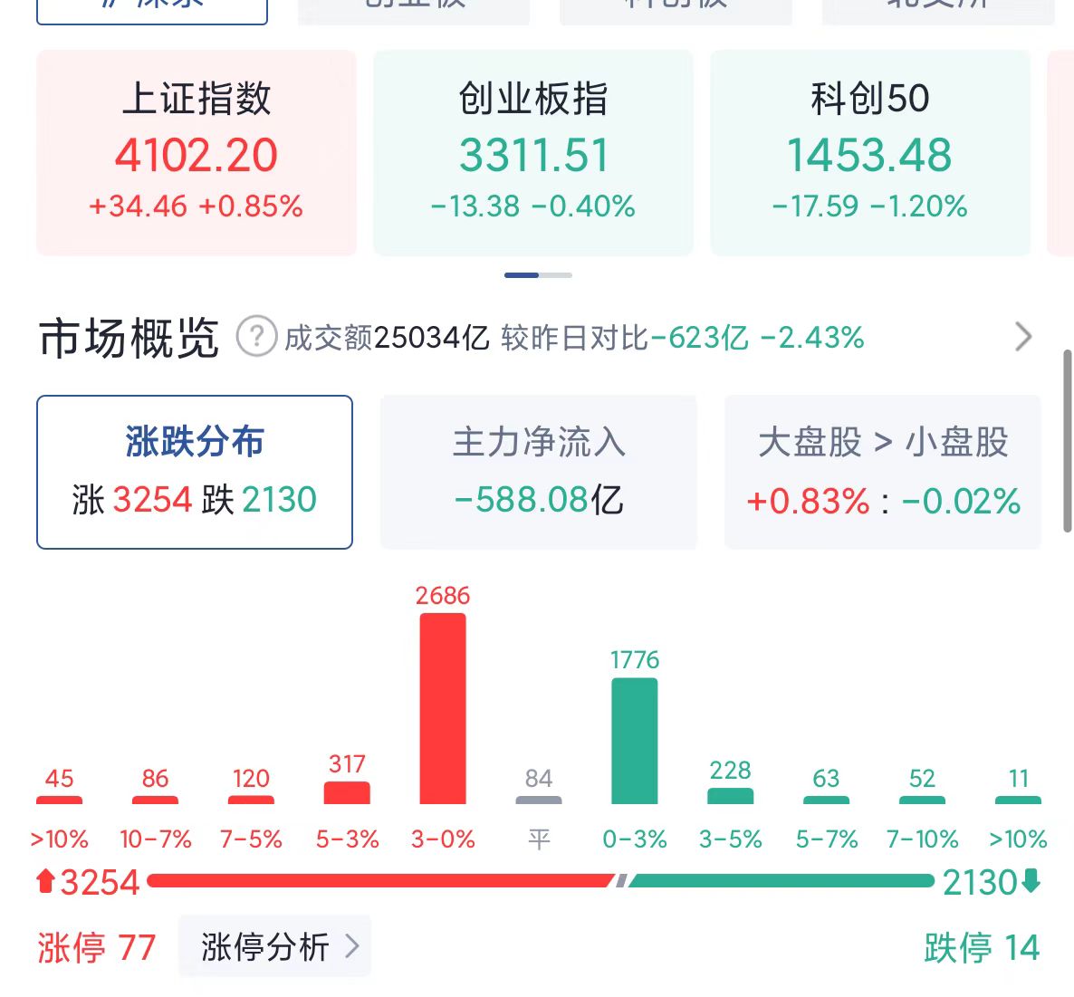 这周行情三天两头整活,今天又是一颗速效救心丸都不够用的魔幻一天!小登全线熄火,老登带头护盘稳指数!创业板一度跌超2%,午后硬是走出V字反转,最终收跌0.4%;反观沪指一路高歌突破4100点,全市场3254家上涨,成交量稳稳站在2.5万亿上方,结构性行情依旧在线,就是大科技人的账户大概率还是绿油油一片!
