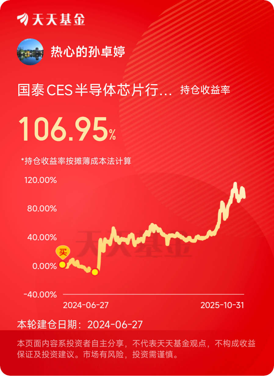 谁懂啊家人们!2024年6月的一次“孤注一掷”,竟让我收获了翻倍的惊喜~ 彼时半导体行业刚走过下行周期尾声,市场还在纠结去库存何时见底,我却毅然一次性重仓这只基金,如今回头看,每一份坚守都成了时光的馈赠