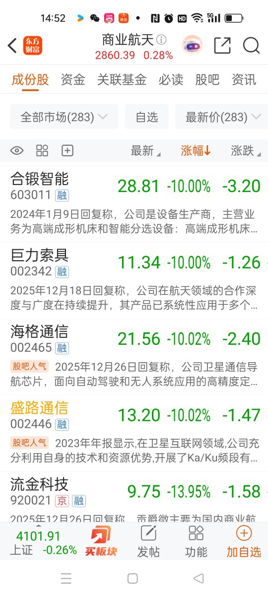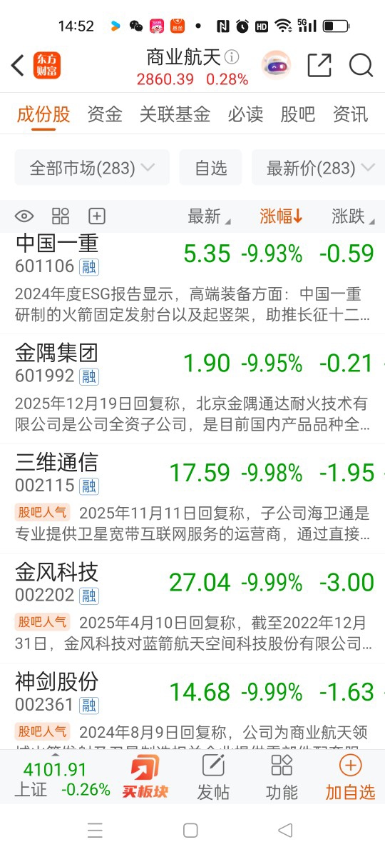 那么商业航天的产业链赛道,上周是跌的很残酷,跌停有几个的都有好多个股,让高位追涨的投资者一片哀嚎,已站在山顶消费了。