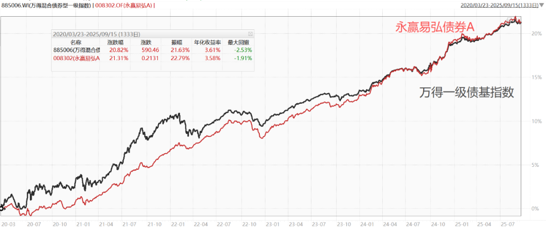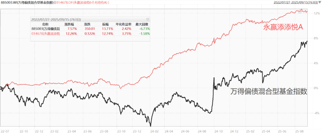 陶毅、刘星宇永赢添添悦,定位追求绝对收益的稳健型固收+,成立至今大幅跑赢了万得偏债混合型基金指数(代表同类基金的平均表现),并且回撤也明显更小。(2022-07-27至2025-09-15,数据来源:Wind)