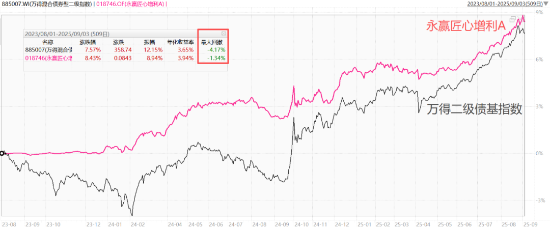 刘星宇、袁旭永赢匠心增利,定位于中波动固收+,采用均衡偏价值的投资策略。虽然在近期市场上涨中不如万得二级债基指数(代表同类平均水平)的进攻性强,但成立至今几次大的回撤都比较好的规避掉了,风险控制能力明显好于同类指数,严格遵守了基金的绝对收益定位。(2023-08-01至2025-09-03,数据来源:Wind)