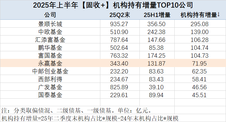 富国、永赢、景顺长城等公司在机构端固收圈都属于高口碑高占比的公司。今年以来,永赢基金虽然主动权益被看到的更多,但其实他们固收类基金规模增长势头依然不减,上半年固收+的规模增量达131.9亿,其中机构端就新增超71亿,行业排名第6。