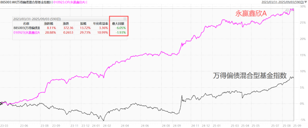 吴玮、卢丽阳永赢鑫欣,其中卢丽阳于2023-3-31接任,当年就以10.36%的收益斩获偏债混同类冠军,至今已经远超万得偏债混合型基金指数(代表同类平均水平),而且风控也非常出色,自卢丽阳管理以来的最大回撤仅-1.93%,这个性价比绝了!(2023-03-23至2025-09-03,数据来源:Wind)