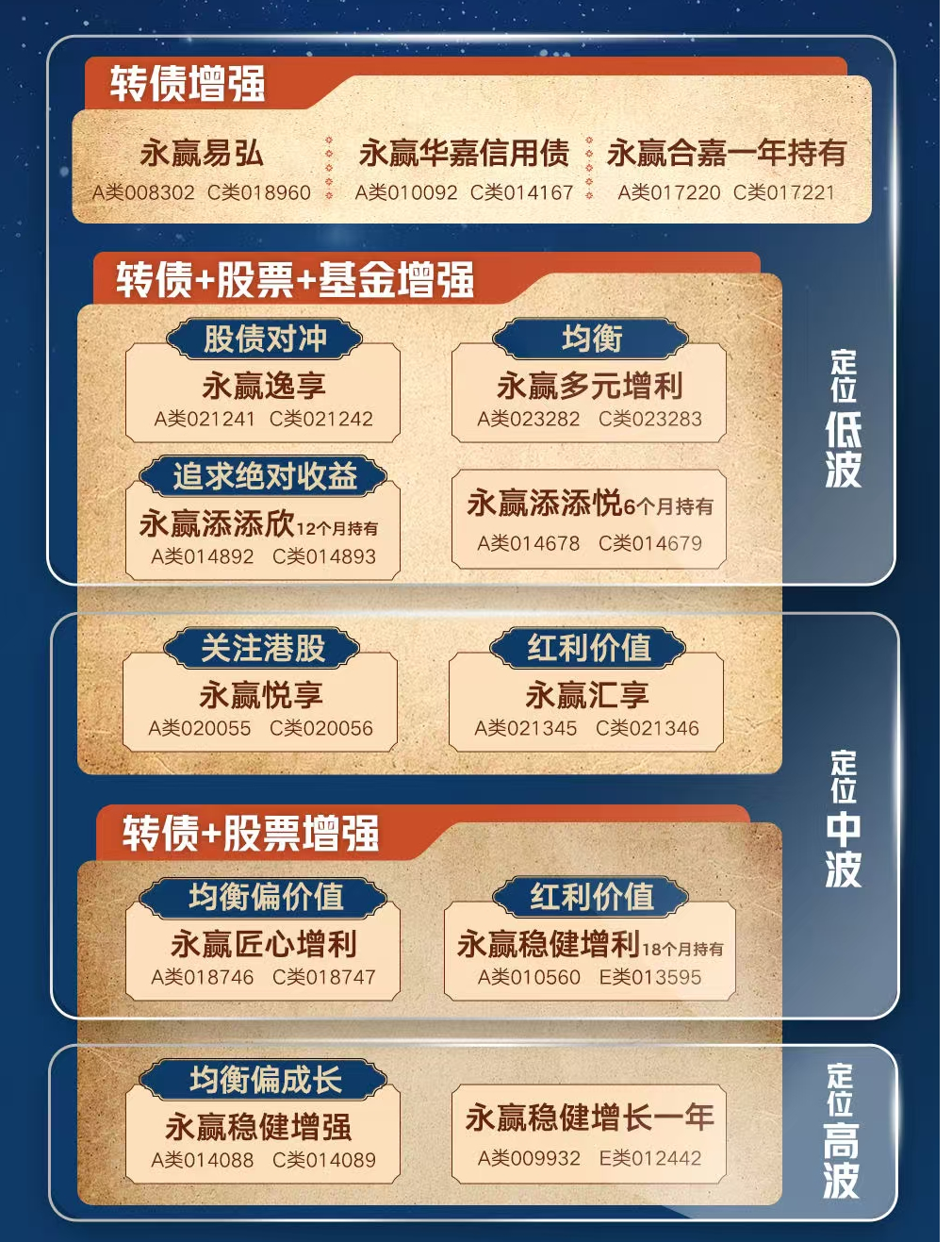 我看过很多永赢基金的固收+宣传海报,他们建立了一个策略和波动明确的产品矩阵,根据高中低波、资产拼配方式进行了分类归集,每个基金的策略标示得清清楚楚。
