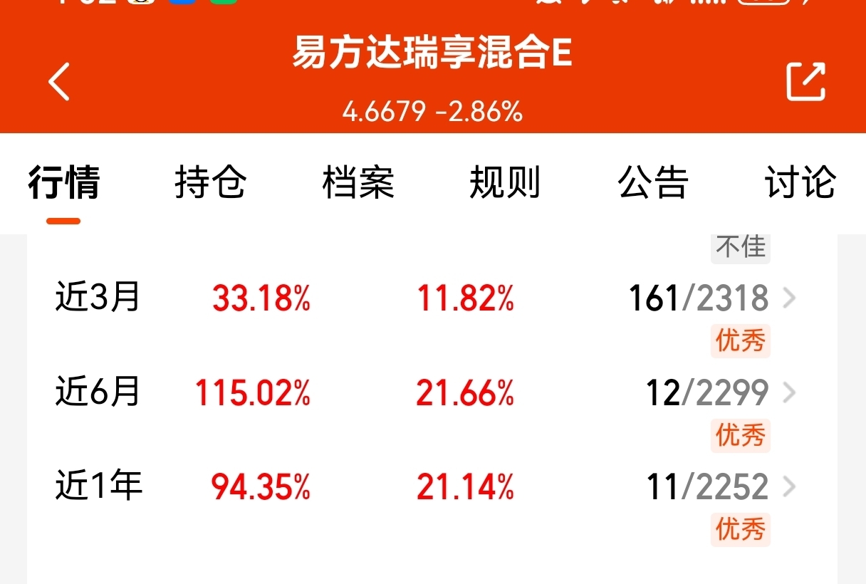 市场全天震荡反弹,沪指刷新年内新高,创业板指领涨。截至收盘,沪指涨0.71%,深成指涨2.02%,创业板指涨3.57%。弹性真的是太好了,科技依然是最亮眼的,易方达瑞享混合E涨得也很好,近三个月涨幅33.18%,近六个月涨幅115.02%,持仓有科技、新能源、制造等。