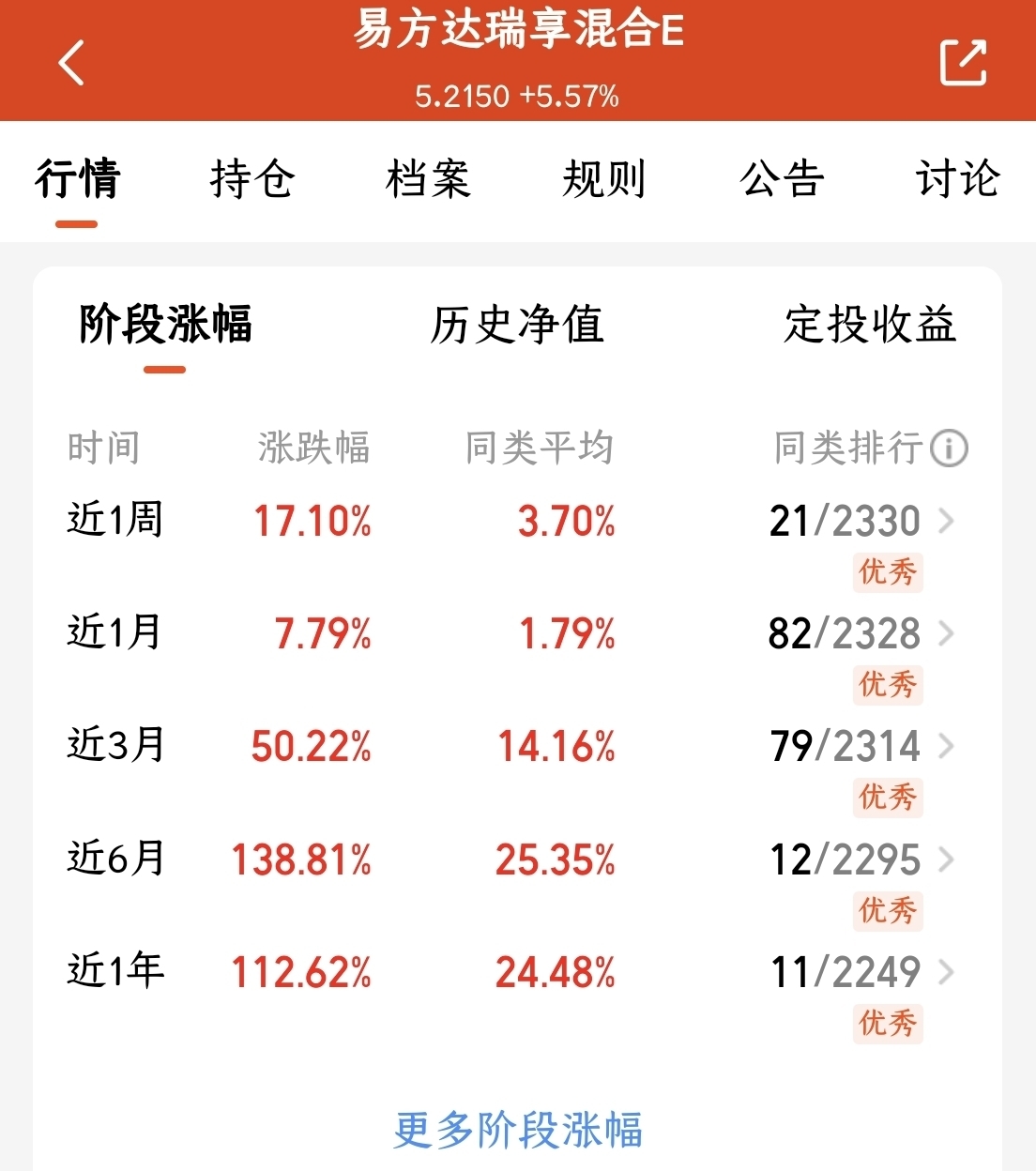 市场行情真是好起来了,沪指都站上4000点了,不过这波还是科技最牛啊,虽然有调整,但是修复起来很快。$易方达瑞享混合E$ 就是追求高锐度爆发行情的好品,不仅涨幅远超同类均值,排名也非常靠前。在牛市中,弹性十足,更能获取超额收益!